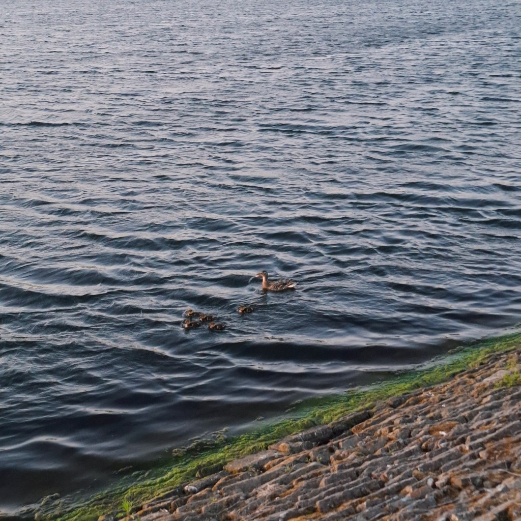 We watch the gulls fishing and a hen escorting her ducklings to the stacked slate boundary of the reservoir.